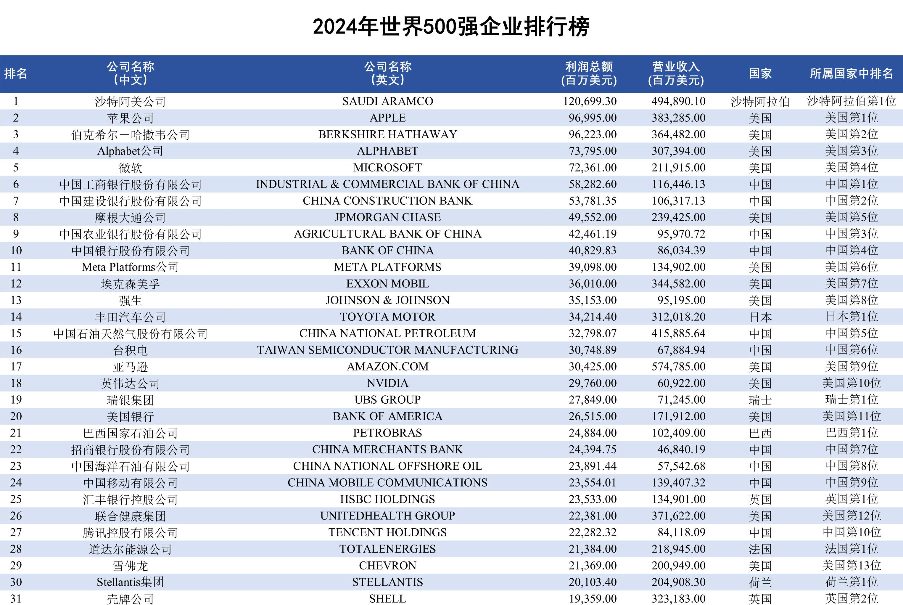 中国百强论坛、华东理工大学民营经济研究院和华顿经济研究院于12月30日在上海联合发布“华顿版2024年世界500强企业排行榜”。不同于《财富》世界500强,该榜单是按照企业利润额进行排序,原始数据主要来源于纽约、伦敦、东京、香港、新加坡、上海等全球各大交易所,部分数据来源于《财富》等媒体机构。