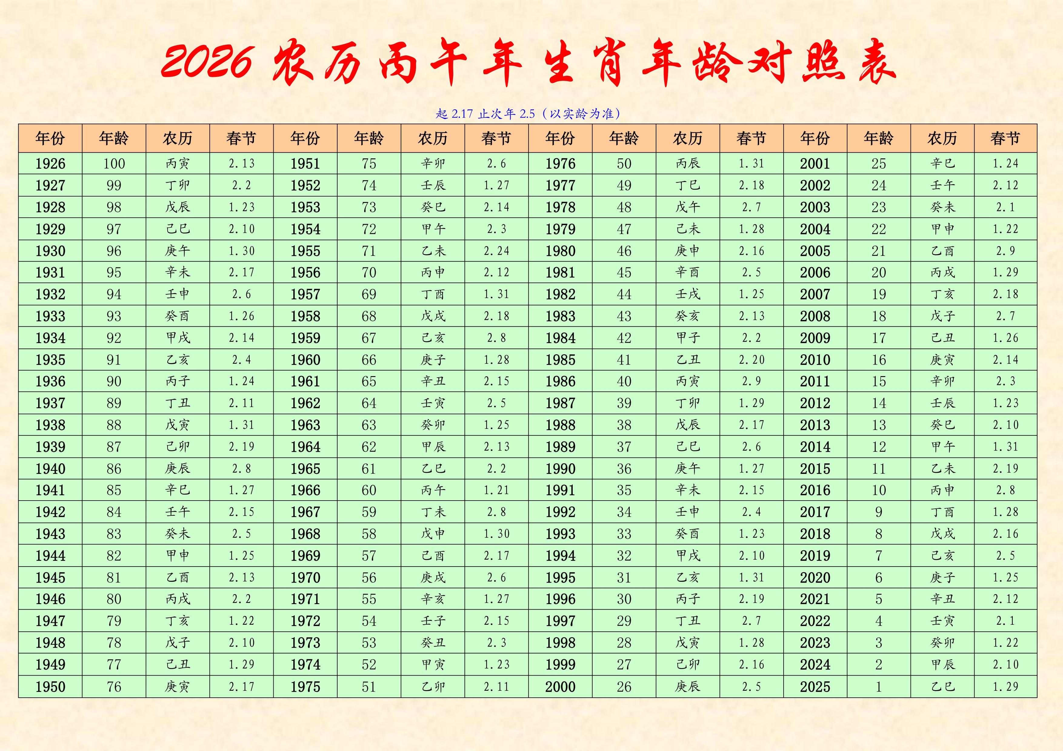 【学习园地】2026年农历丙午年生肖年龄对照表