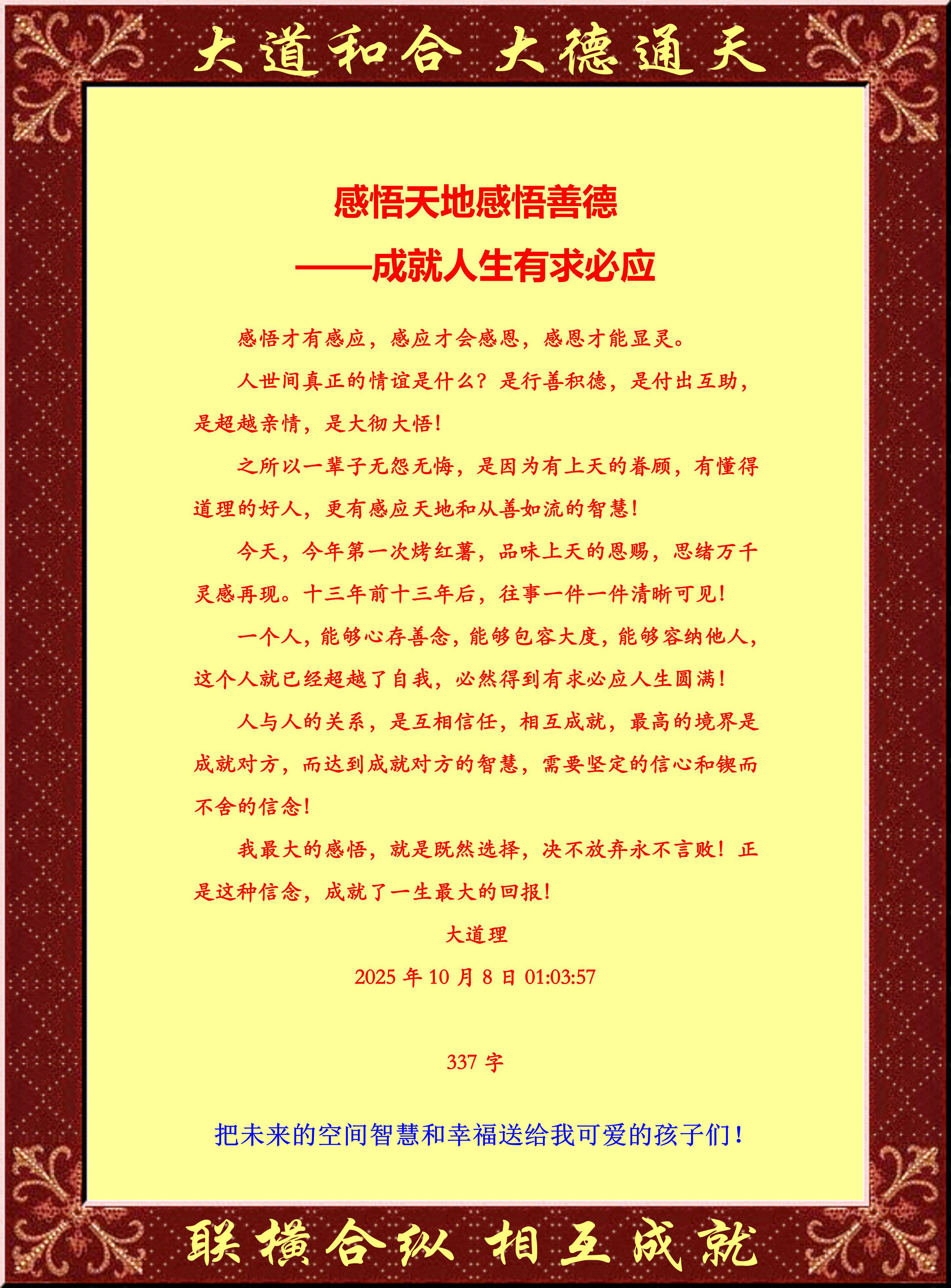 之所以一辈子无怨无悔,是因为有上天的眷顾,有懂得道理的好人,更有感应天地和从善如流的智慧!