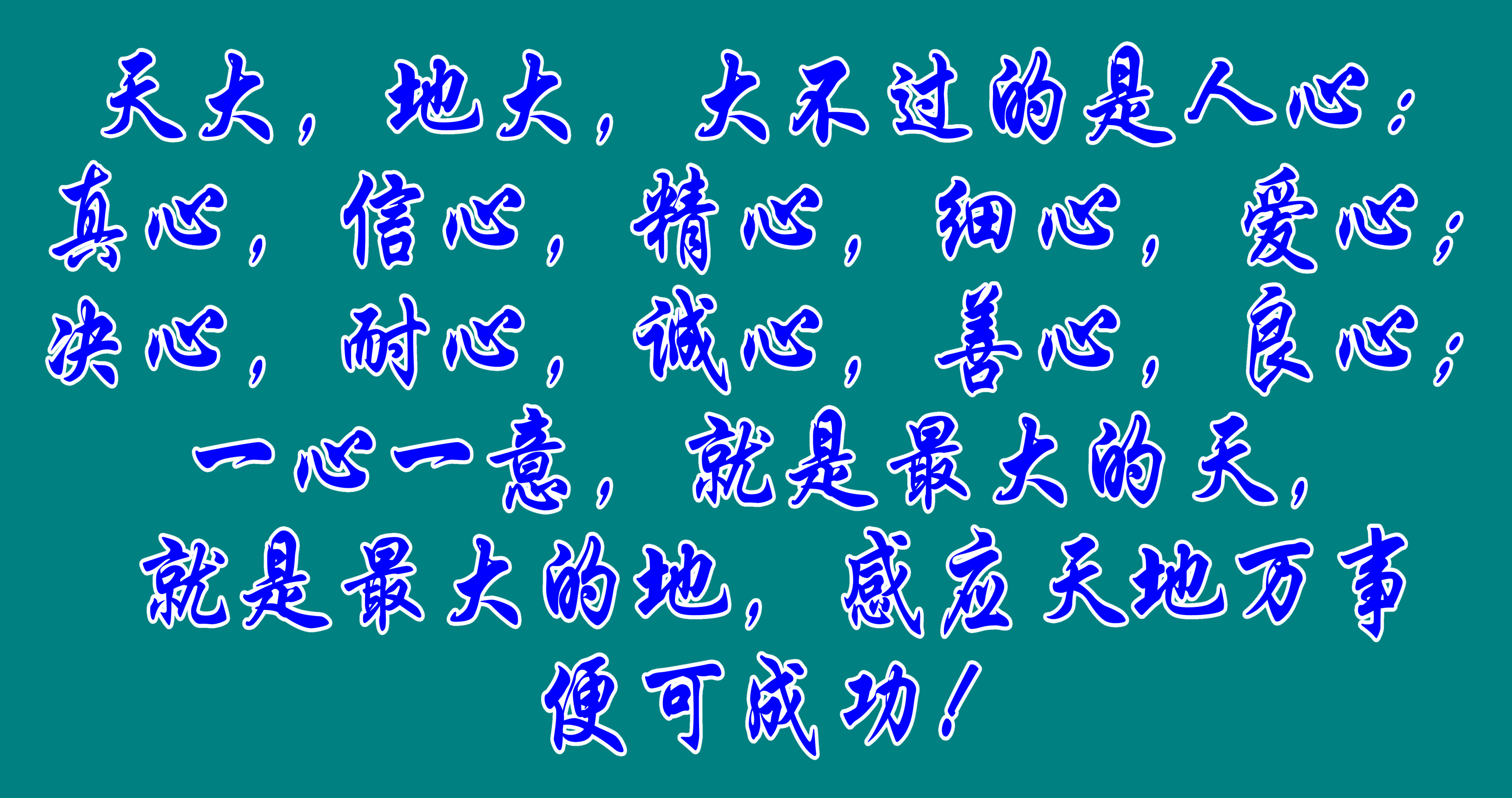 天大,地大,大不过的是人心:真心,信心,精心,细心,爱心;决心,耐心,诚心,善心,良心;一心一意,就是最大的天,就是最大的地,感应天地万事便可成功!