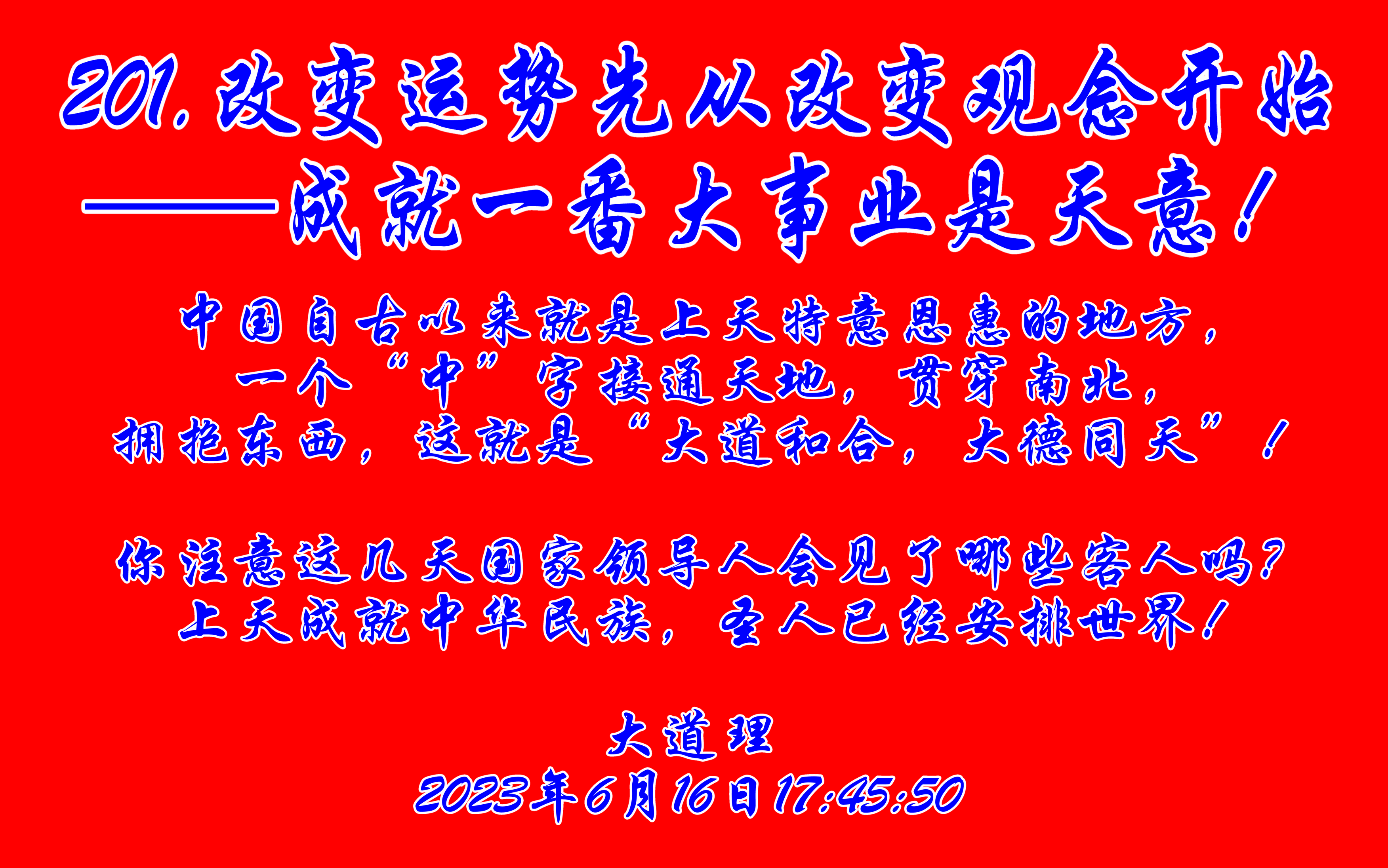 中国自古以来就是上天特意恩惠的地方,一个“中”字接通天地,贯穿南北,拥抱东西,这就是“大道和合,大德同天”!你注意这几天国家领导人会见了哪些客人吗?上天成就中华民族,圣人已经安排世界!