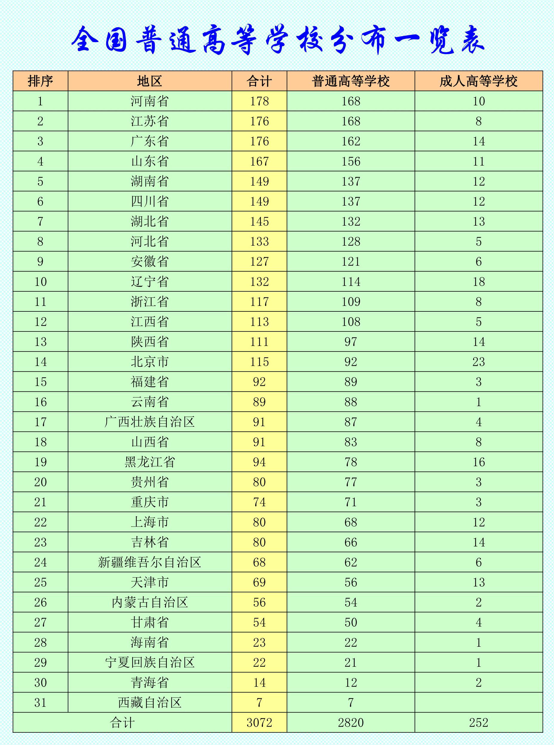 教育部昨天发布了2023年全国高等学校名单,根据名单我编辑了全国各地区高等学校分布一览表。