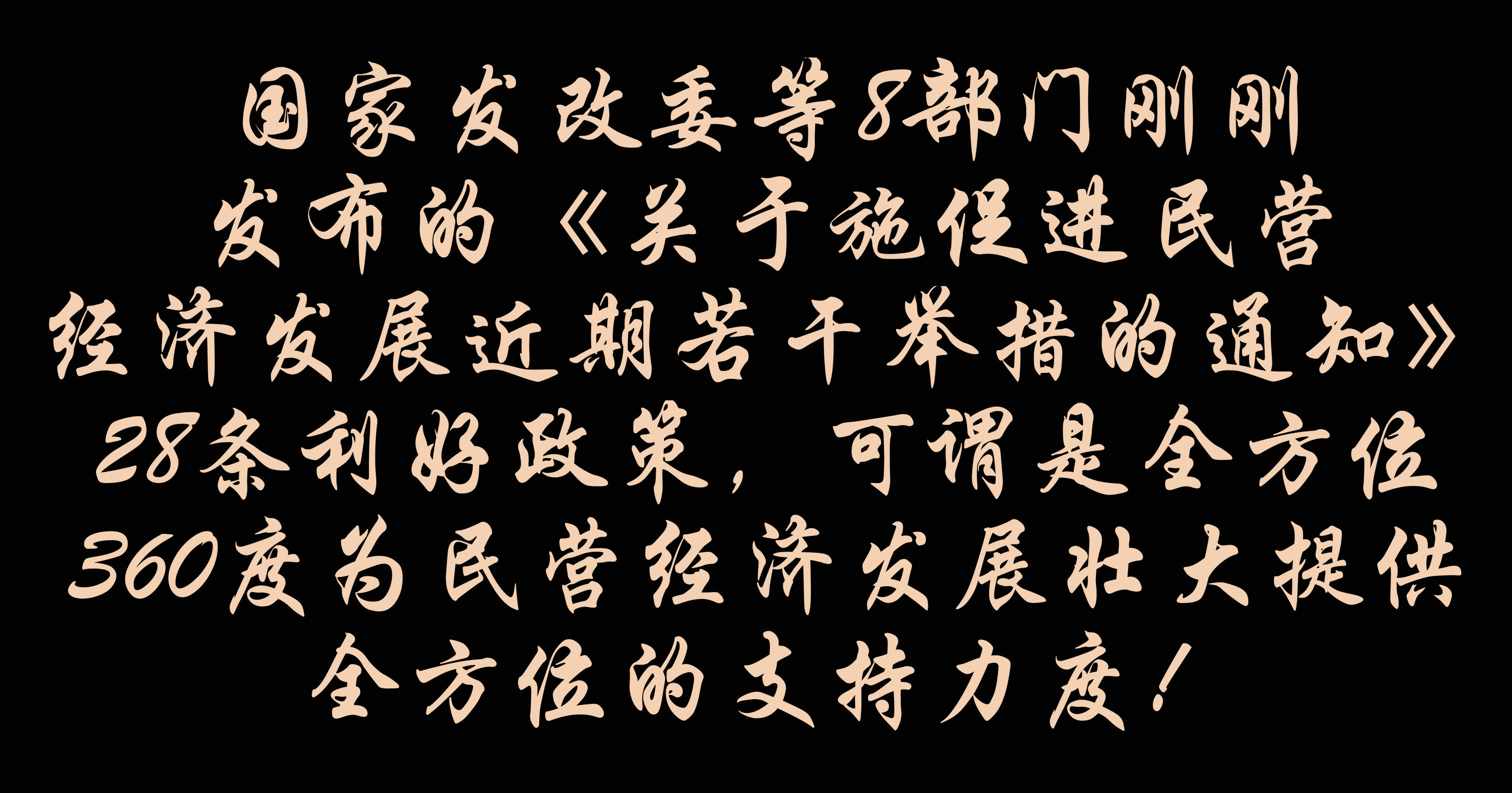 国家发改委等8部门刚刚发布的《关于实施促进民营经济发展近期若干举措的通知》28条利好政策,可谓是全方位360度为民营经济发展壮大提供全方位支持的力度,对于民营企业来说可谓是千载难逢的机遇期,对于民营企业家来说可谓是定心丸和助跑器,把做大做强自己的企业作为一种使命和任务,这才是对国家和民族义不容辞的责任的最好行动!