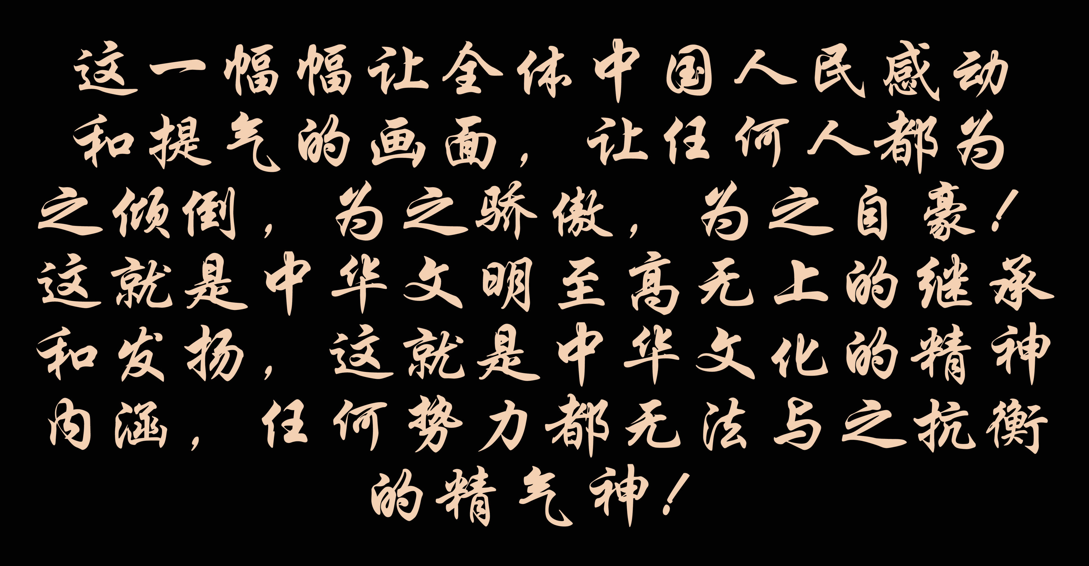 这一幅幅让全体中国人民感动和提气的画面,让任何人都为之倾倒,为之骄傲,为之自豪!这就是中华文明至高无上的继承和发扬,这就是中华文化的精神内涵,任何势力都无法与之抗衡的精气神!