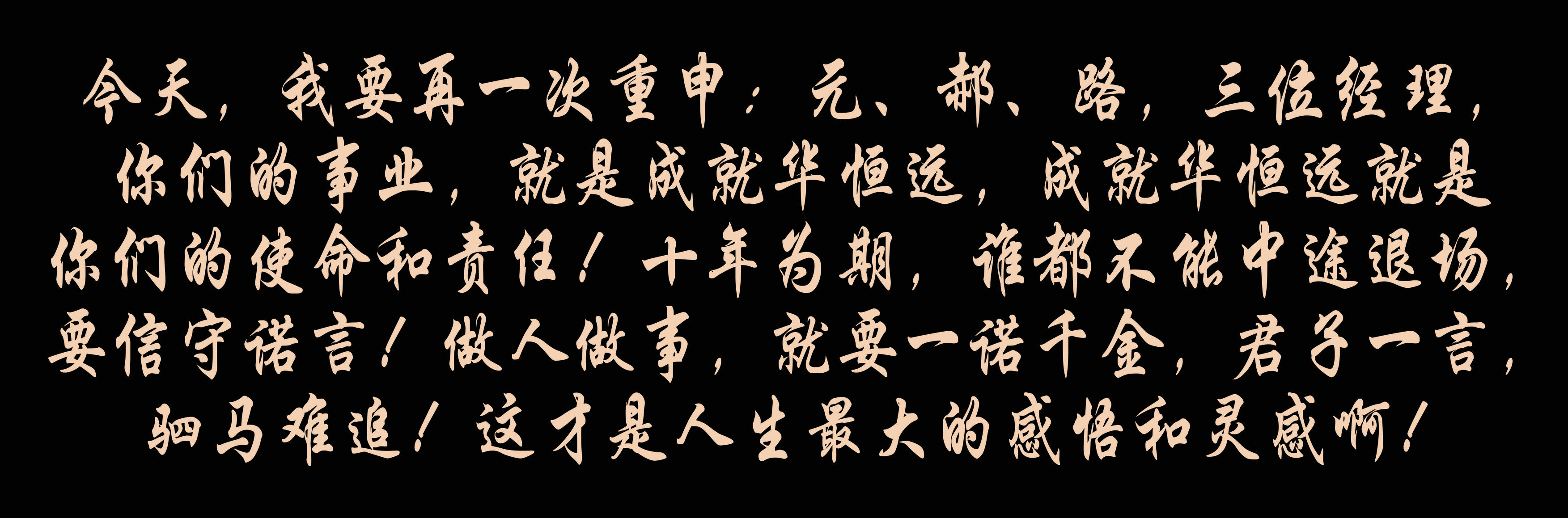 今天,我要再一次重申:元、郝、路,三位经理,你们的事业,就是成就乐天堂fun88,成就乐天堂fun88就是你们的使命和责任!十年为期,谁都不能中途退场,要信守诺言!做人做事,就要一诺千金,君子一言,驷马难追!