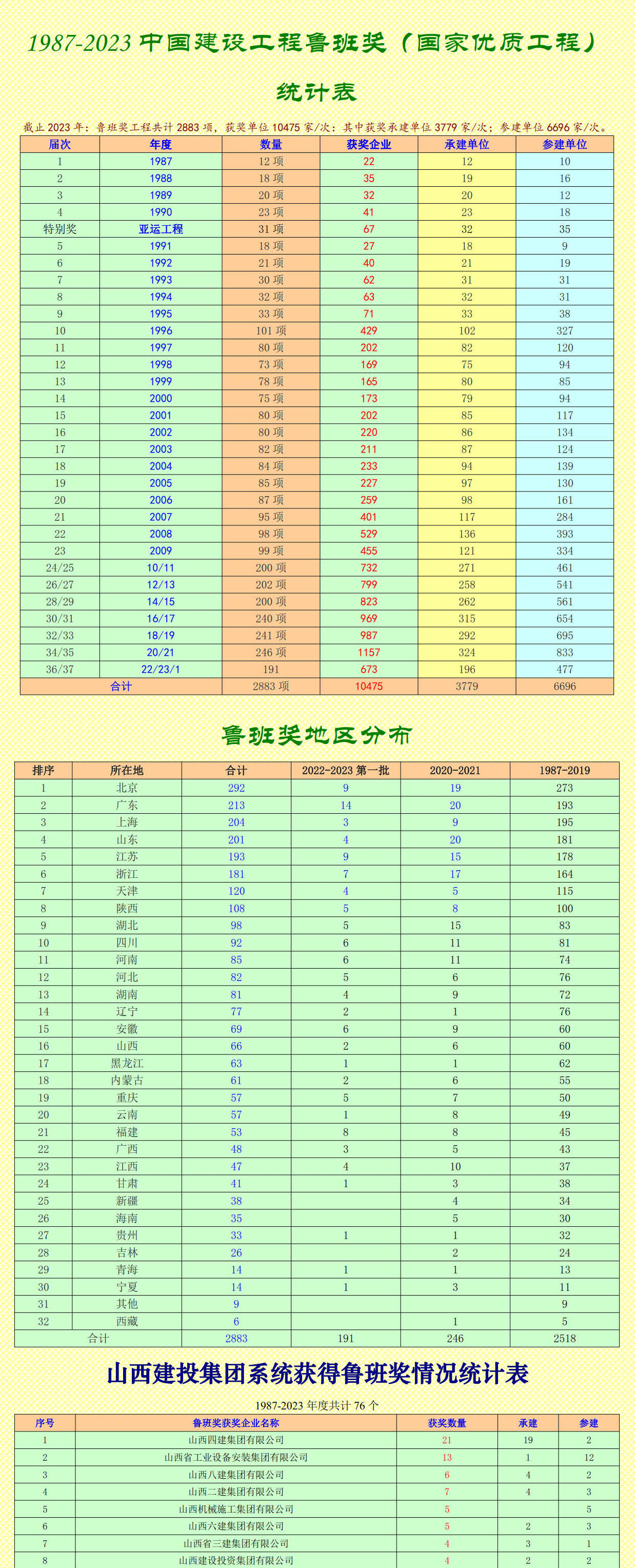 截止2023年:鲁班奖工程共计2883项,获奖单位10475家/次:其中获奖承建单位3779家/次;参建单位6696家/次。