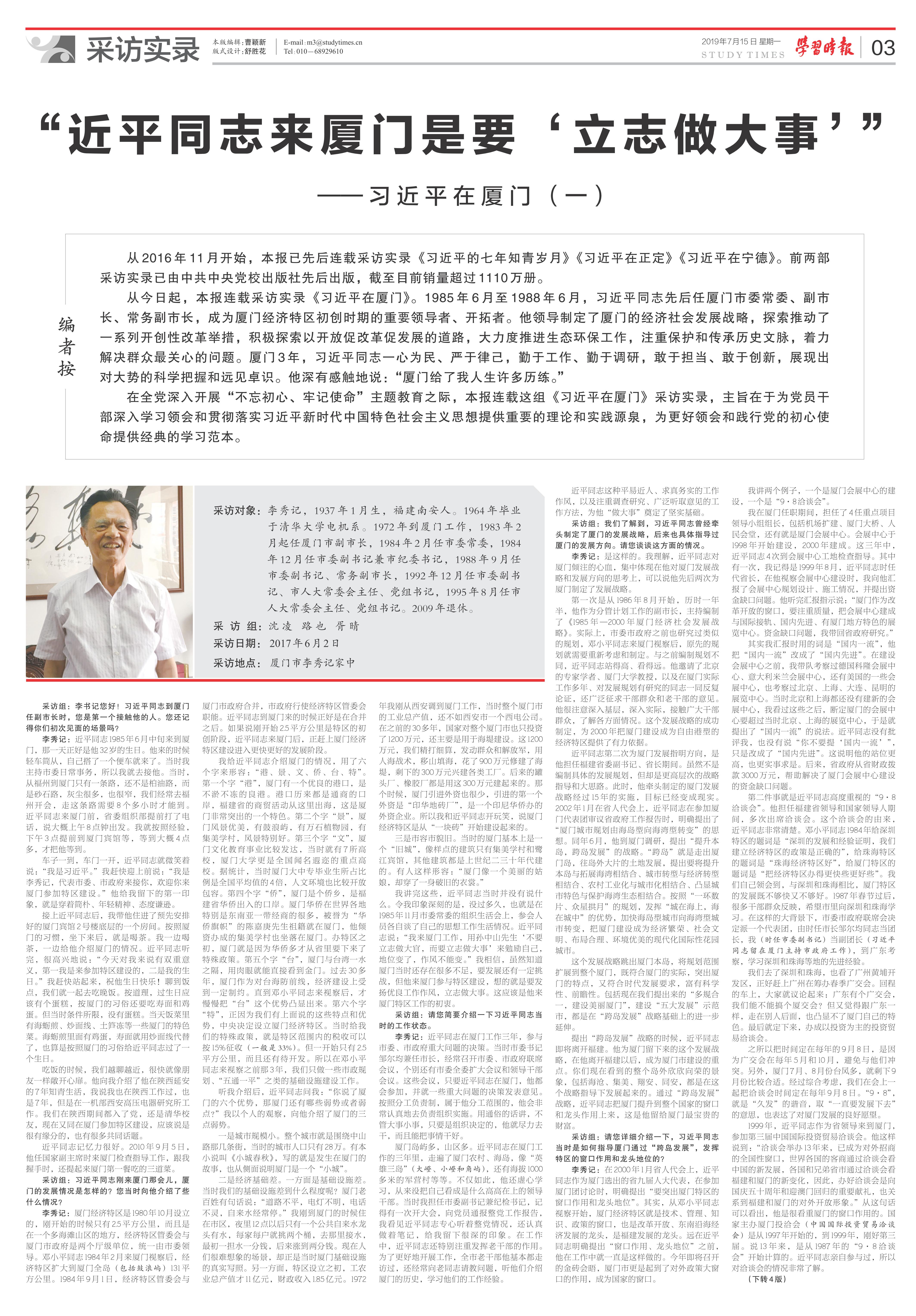 李秀记:近平同志在厦门工作三年,参与市委、市政府重大问题的决策。当时市委书记邹尔均兼任市长,经常召开市委、市政府联席会议,个别还有市委全委扩大会议和领导干部会议。这些会议,只要近平同志在厦门,他都会参加,并就一些重大问题的决策发表意见。按照分工负责制,属于他分工范围的,他会非常认真地去负责组织实施。用通俗的话讲,不管大事小事,只要是组织决定的,他就尽力去干,而且能把事情干好。…[详细]
