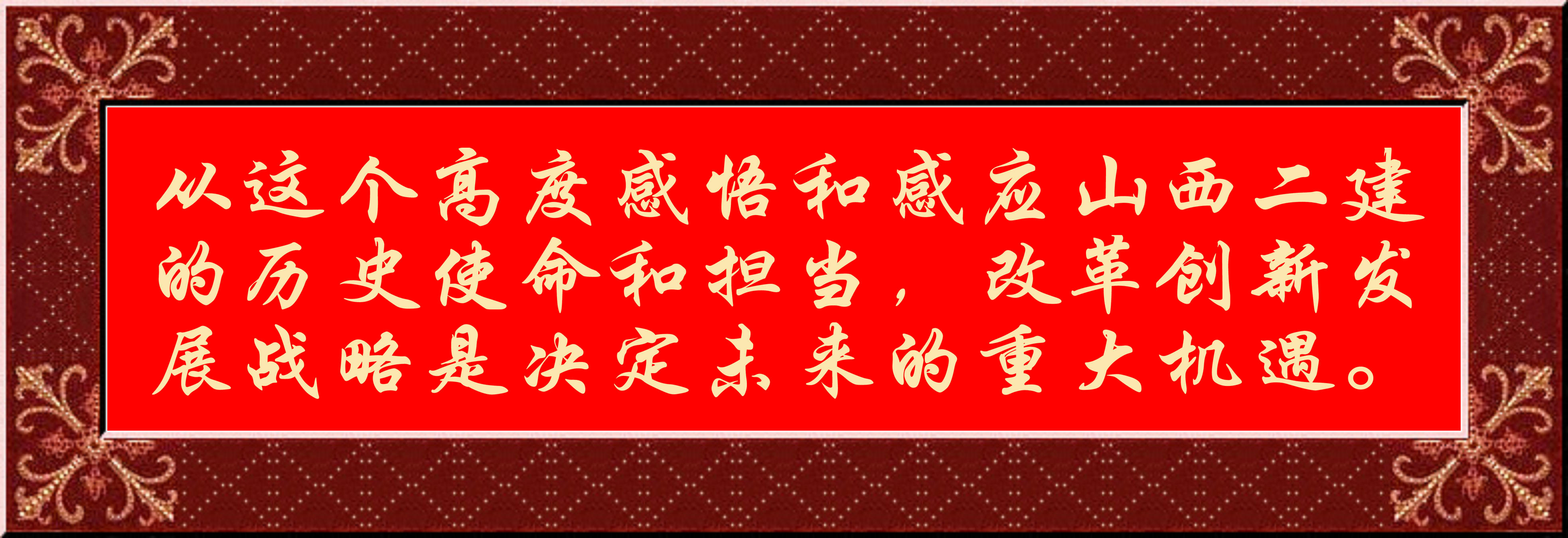 从三个新奇迹的高度感悟和感应山西二建当前和未来的历史使命和担当,改革创新发展战略是决定未来成就的必由之路和重大机遇。今后二十五年是关键!是对每一位接棒新掌门人提出的历史问卷,如何破题?如何超越?如何创造新的奇迹?!