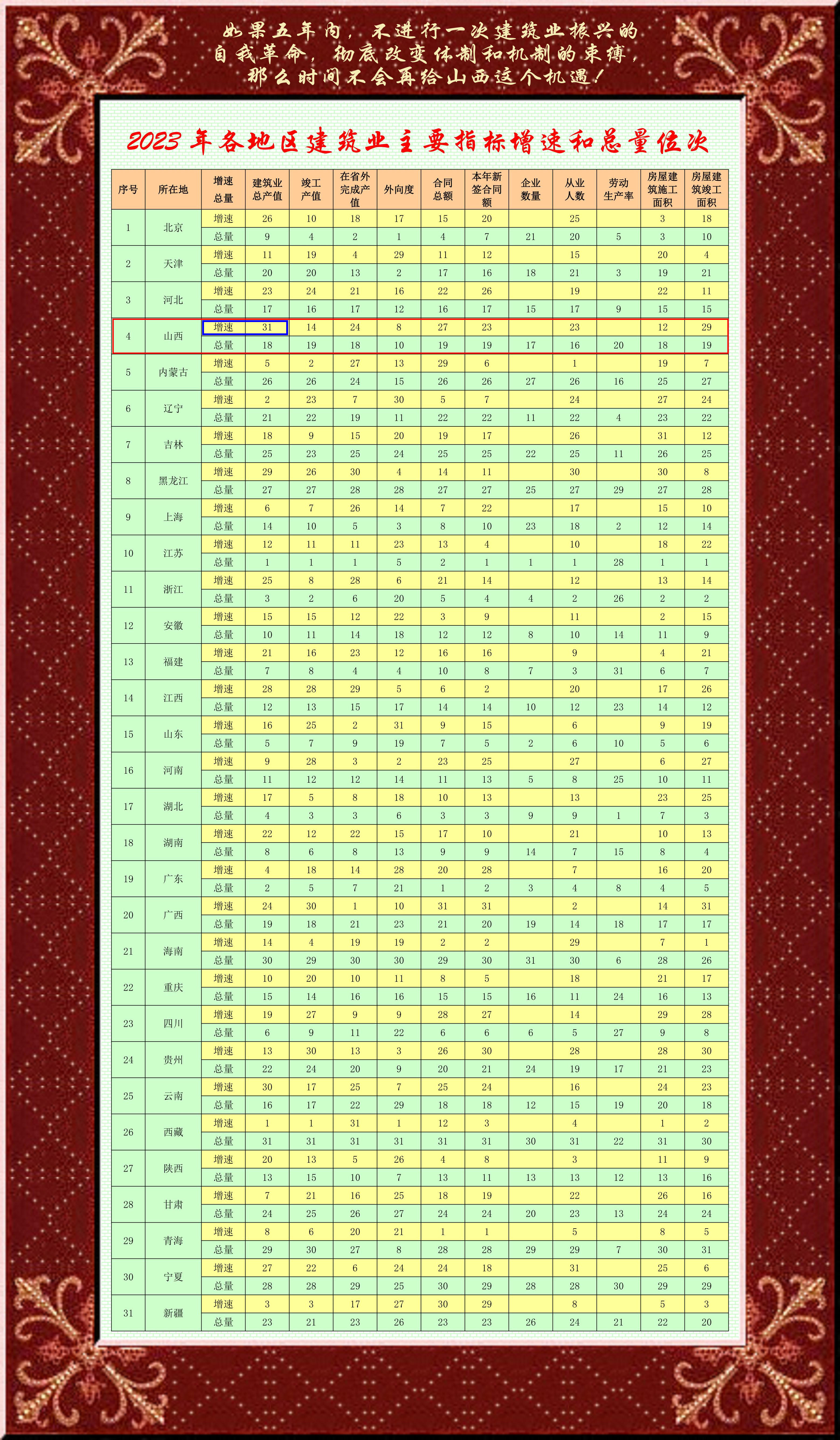 昨天,中国建筑业协会发布《2023年建筑业发展统计分析》,山西省建筑业主要指标增速全国垫底,总量排全国第18位,居全国中下水平。这个结果是意料之中的结果,更深层次又反映出什么问题呢?三个字:不重视!